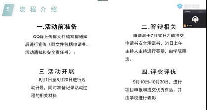 本次线上培训共分为四个环节:历届“三下乡”成果回顾、本届“三下乡”政策解读、“以老带新”学长经验分享、教师指导与答疑。鉴于今年新冠疫情的特殊情况,本次“三下乡”活动拟采用云采访、云调研等新形式,这对同学们提出了新挑战新要求。同时,此次活动还增加了 “四个一百” 评选激励机制,进一步激发了同学们的兴趣与热情。