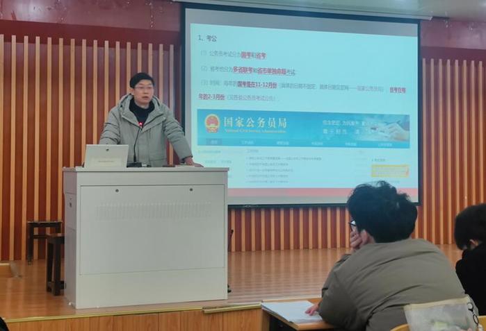 会上,年级辅导员结合往届毕业生的就业去向及相关就业政策做了详细介绍,针对同学们关心的就业信息资源问题详细介绍了我校就业网站的相关内容板块,并就企业招聘宣讲会信息、招聘简章等相关内容做了重点介绍;随后就考公考编时间线、报考事宜、复习准备等做了基本分享,对于同学们关注度相对较高的“选调生”报考等政策做了宣讲。对于有升学、考研计划的同学就相关重要时间节点、报考注意事项、考研准备攻略等做了详细指导;最后就同学们关心的“征兵入伍”“推免夏令营”等事宜做了简要介绍。在总结讲话中,年级辅导员表示希望与会同学们能够积极开展自我探索,尽快明晰职业发展方向,做好及时查漏补缺,为接下来的就业准备做好积极应对。