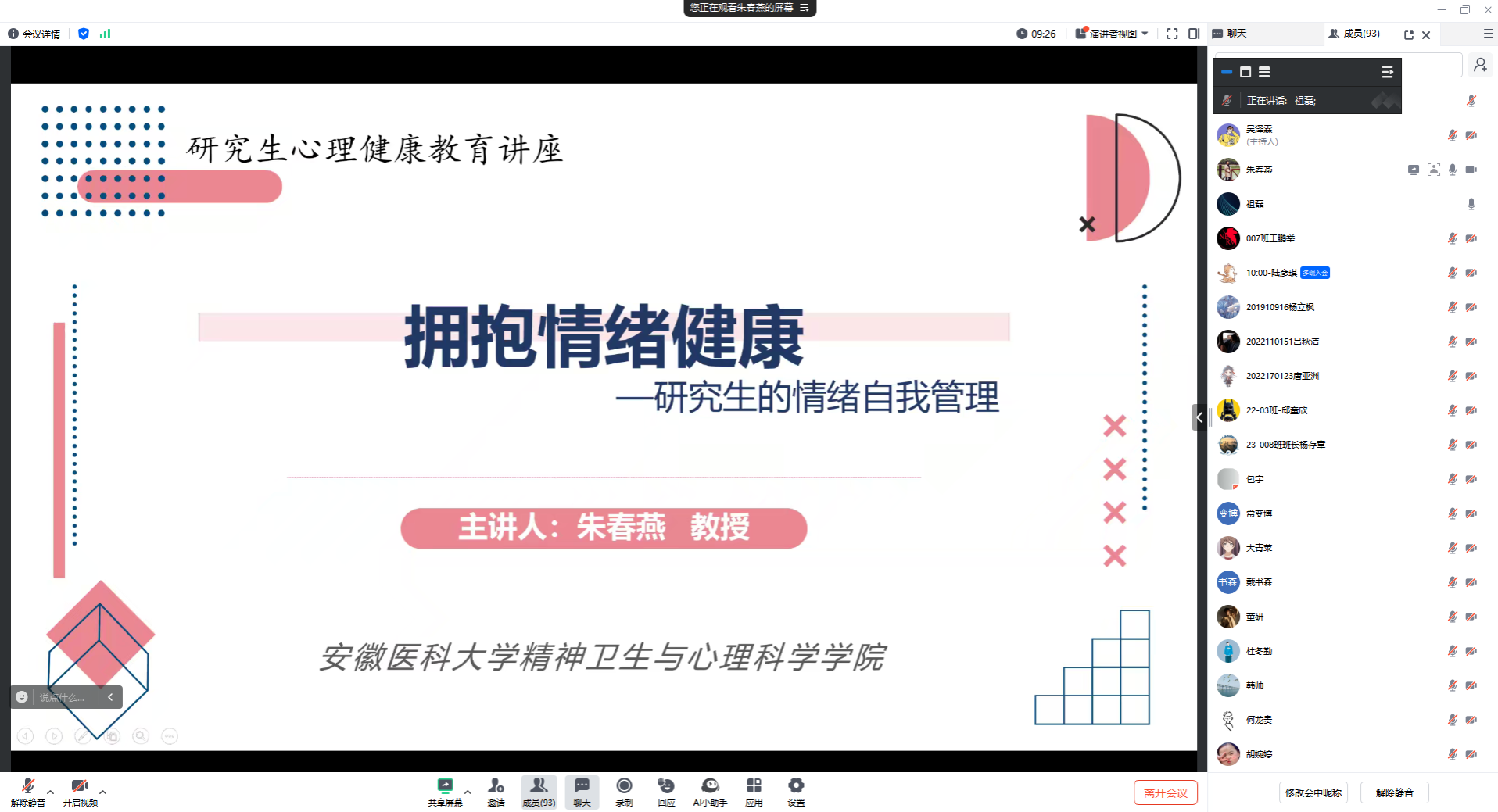 线上举办了“拥抱情绪健康---研究生的情绪自我管理”主题报告会。本次报告邀请了安徽医科大学精神卫生与心理科学学院院长朱春燕教授担任主讲人,报告会由星空娱乐