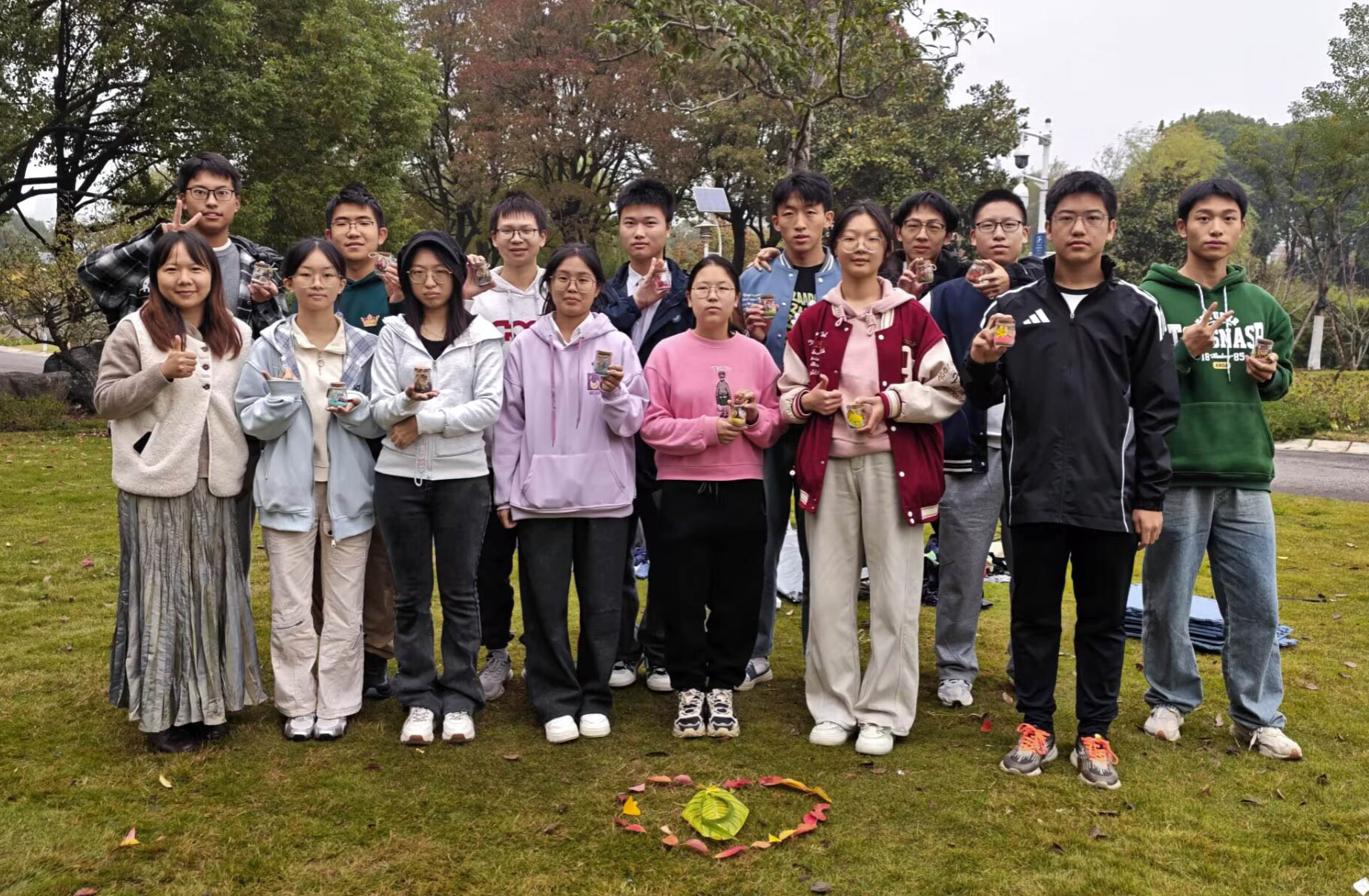 本次活动设置了“破冰、手作、静观、分享”四个环节。在“我的情绪落叶”破冰活动中,同学们在公园中寻找最能映照当下心情的落叶,并通过自我介绍与选择落叶原因的分享,迅速拉近距离。随后,大家将收集的落叶共同拼成爱心图案,以集体合影定格温暖的瞬间。在“立冬押花许愿瓶”手作环节,同学们依次将细沙、泥土、落叶、干花与写有心愿的纸条分层装入瓶中,借由象征性的创作过程表达情绪,调节当前的状态,也寄托了对未来学习与生活的美好愿景。活动中,陈紫燕带领同学们进行“立冬正念呼吸”练习,引导同学们在宁静的呼吸间关注当下、接纳自我。活动尾声,同学们围坐在一起,分享参与感受,大家纷纷表示在自然与创作的氛围中获得了有效的压力释放与情绪调节。