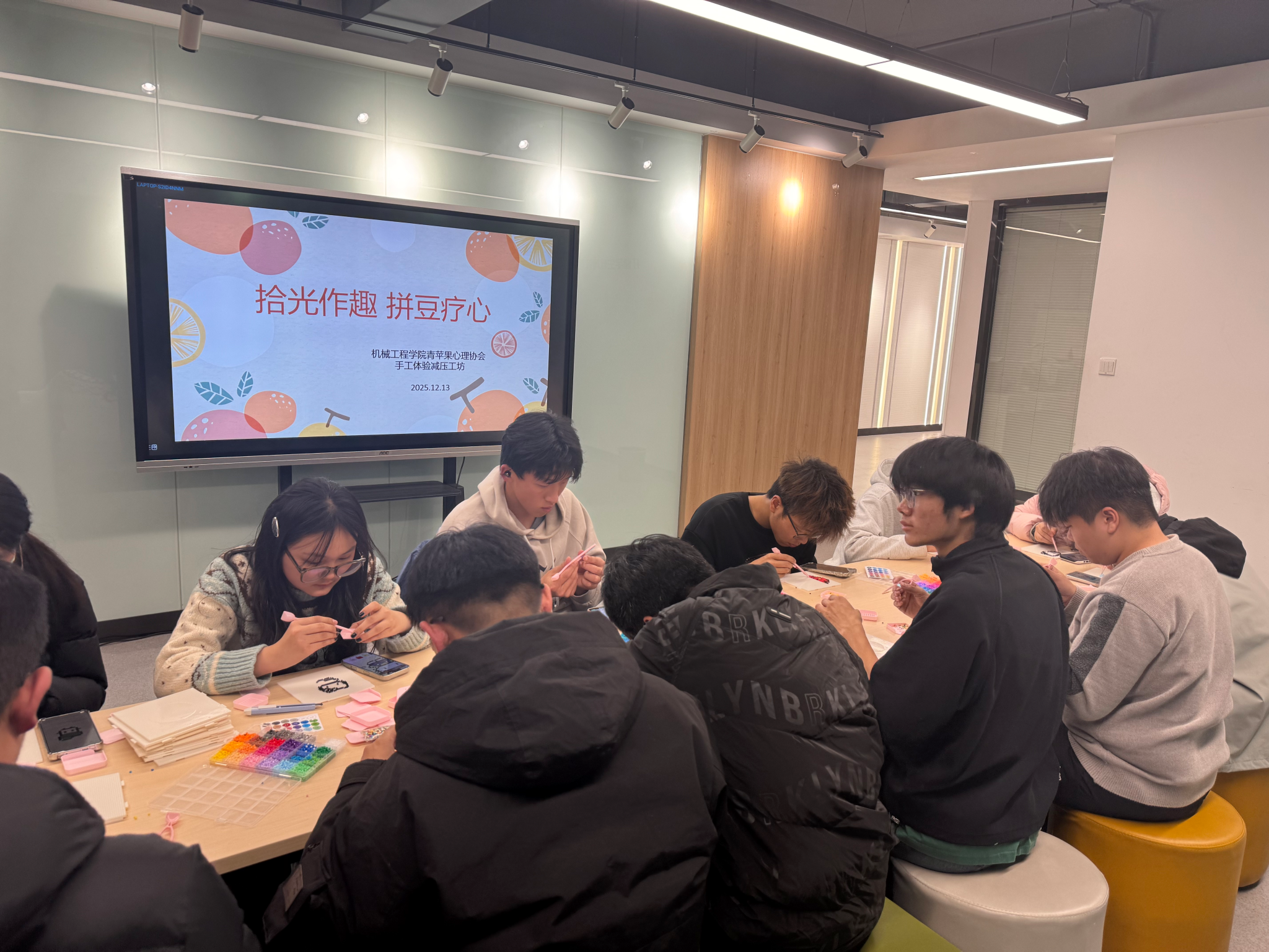 在翡翠湖校区2号楼学生社区沙龙空间举办“拾光作趣,拼豆疗心”减压工作坊活动,机械学院部分同学参与本次活动。