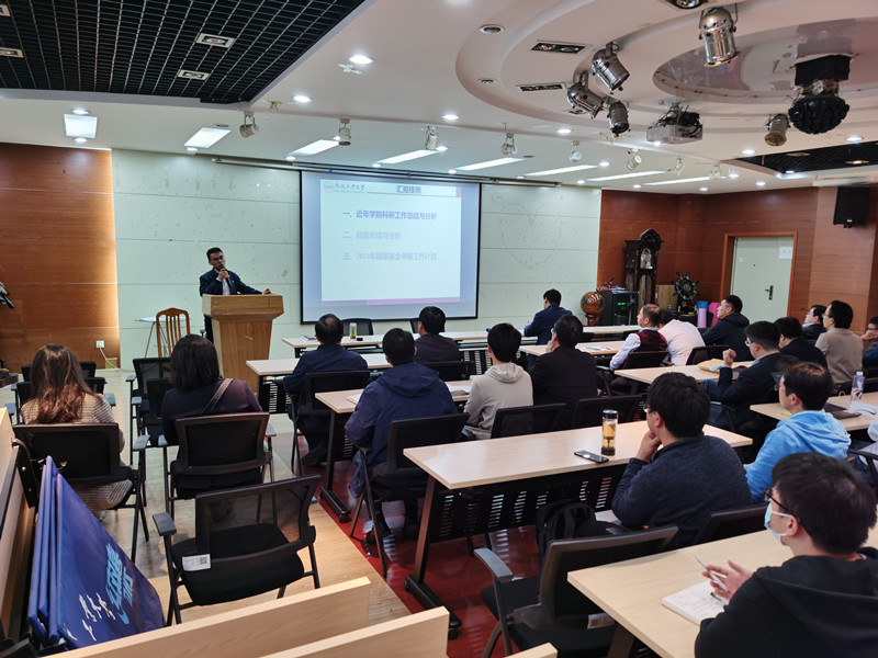 訾斌院长围绕当前科研形势以及国家推进有组织科研的战略规划,指出国家基金及重大重点类科研项目是学院学科发展的重要支撑,强调了基金对于青年教师成长、提升科研能力的重要意义,并对2023年国家基金、各类重大重点项目等申报工作进行了总体部署。