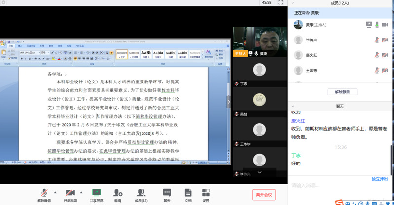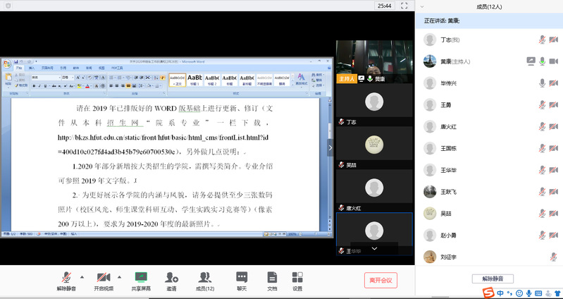 3月3日下午15:00-16:30分,学院召开2019-2020年度招生工作和毕业设计教学规范制订工作视频会。会议由教学副院长黄康主持,毕传兴,王勇,赵小勇,唐火红,刘征宇,王国栋,王跃飞,王华毕,李德宝,吴喆,丁志等参加了会议。