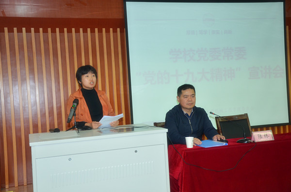 陆林书记分别从党的十九大盛况,党的十九大主要精神,中央纪委工作报告主要精神,中国共产党章程修正案主要精神,十八届中央委员会决议的精神,十八届中央纪律委员会报告精神,中国共产党章程修正案决议主要精神,习近平总书记在党的十九大闭幕会上重要讲话精神等八个方面给我们作了宣讲,陆林书记强调,要紧紧围绕在以习近平同志为核心的党中央周围,每位党员要自觉践行“四个意识”, 把着力点聚焦到习近平新时代中国特色社会主义思想是党必须长期坚持的指导思想上,聚焦到5年来党和国家事业取得历史性成就和发生历史性变革上,全校师生要通过理论学习,实践活动等方式,全面理解和把握党的十九大精神的核心要义,担负起自身的历史使命!