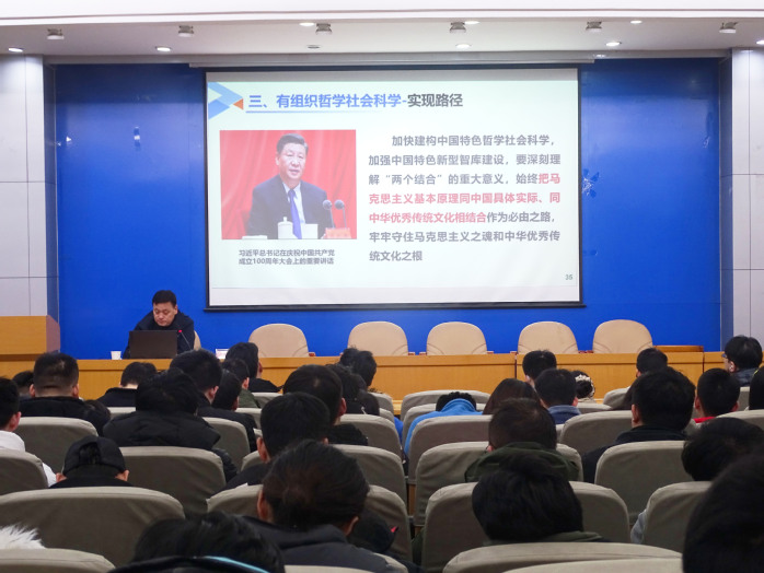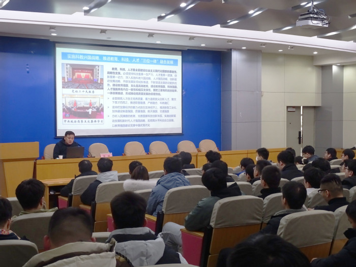 院长訾斌教授以“施科教兴国战略,推进教育、科技、人才‘三位一体’融合发展”为题在格物楼214报告厅为研究生作专题报告。