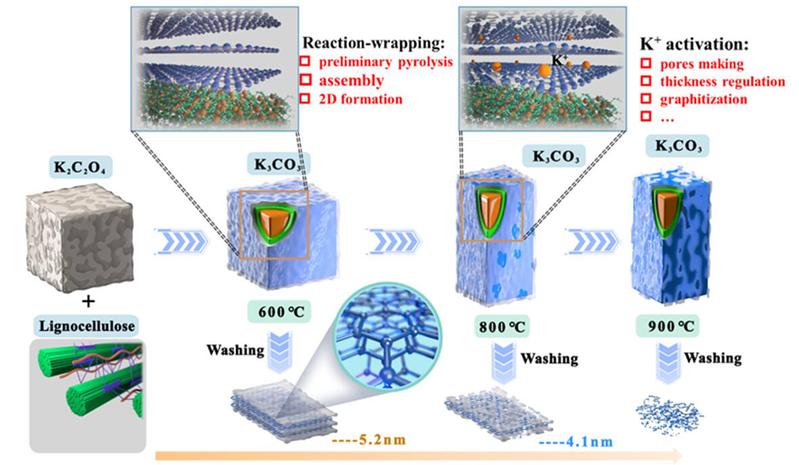 生物质低碳技术与装备研究所马培勇教授团队,利用来源广泛的农林生物质与草酸钾在氮气氛围下直接共热解,成功制备出比表面积高、孔隙结构发达、碳层厚度可调的超薄二维多孔碳材料,在电化学储能方面展现出了极大的潜力。研究发现草酸钾在热解过程中首先作为反应物参与生物质热解反应,其分解产物碳酸钾则作为原位模板剂和活化剂。碳酸钾通过活化外层碳结构形成纳米孔,并调节碳材料的厚度和石墨化程度。此外,研究发现在载气中添加0.2 vol% NH3,可以在不破坏超薄二维结构的情况下,实现N原子掺杂并提高材料比表面积(1802 m2 g−1)。作为钠离子电容器的正极,该材料表现出优异的电化学性能,特别是在0.1 A g-1 ~ 2 A g-1的情况下,其容量保持率高达90.3%。二维多孔结构、高比表面积和丰富的吡啶-N含量显著增强了离子的传递和储存,优化了载流子的吸附和解吸。本研究可为开发低成本、绿色环保的二维多孔碳材料提供有益的参考。