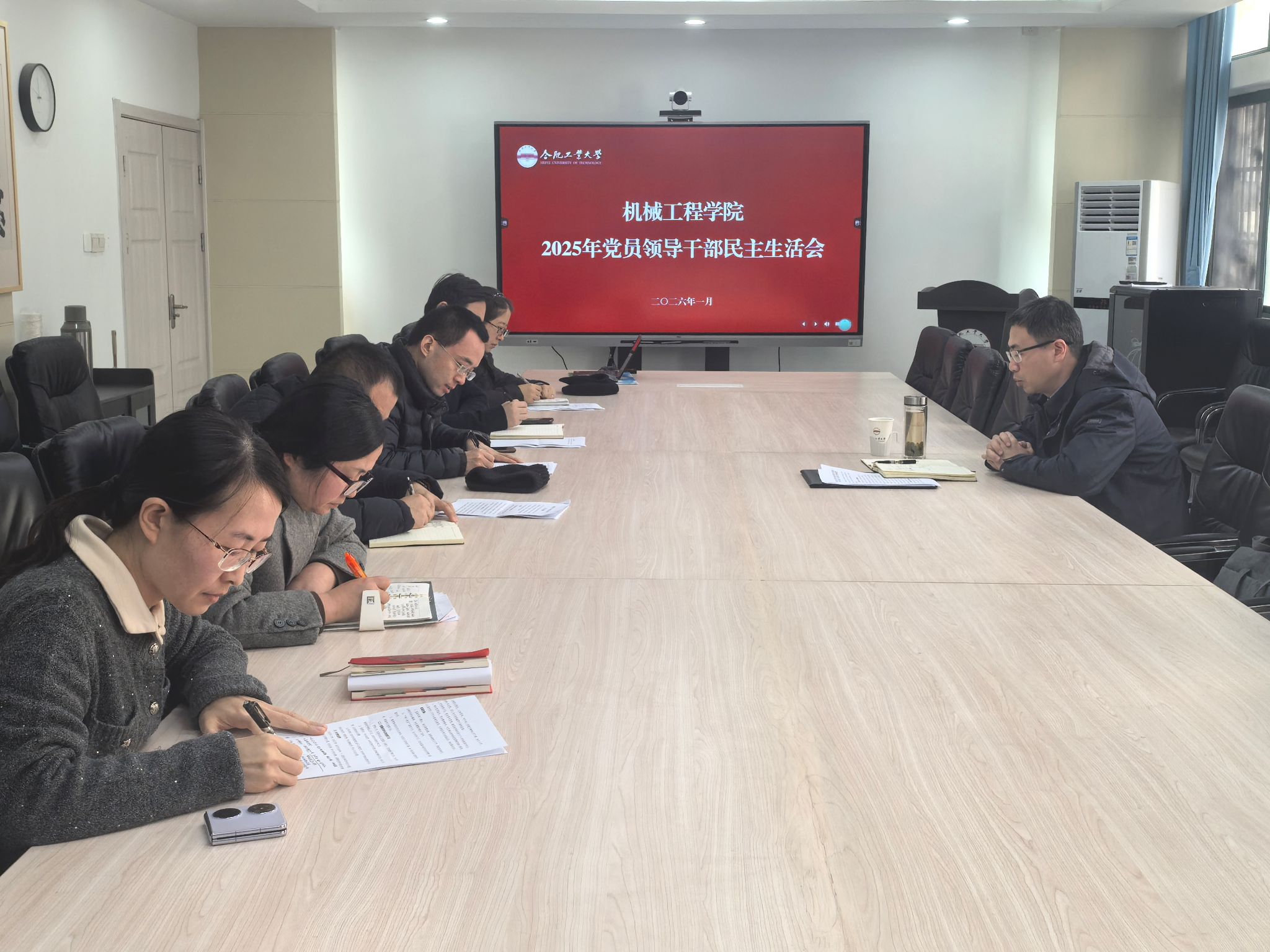 2025年度党员领导干部民主生活会在学工北楼202会议室召开,校党委副书记胡笑旋出席会议并督导点评,学院中层党员领导干部参加会议。