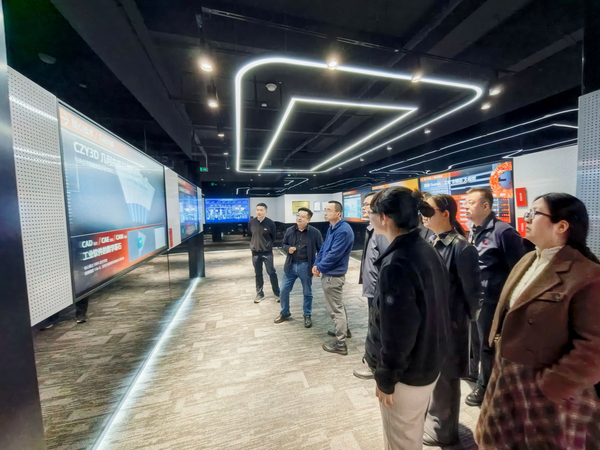 在炽橙科技总经理、合肥工业大学杰出校友纪尧华的陪同下,调研组一行参观了公司数字科技展厅,深入了解企业在虚拟现实、数字孪生及工业智能体等领域的核心技术成果与应用场景。