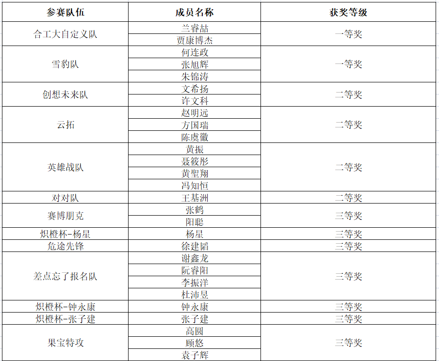 根据合肥工业大学第一届“炽橙杯”3D创智大赛设立的要求,本着公开、公正、公平的原则,经过初赛、决赛,评审委员会严格遴选13个团队获奖。现将获奖人员名单予以公示: