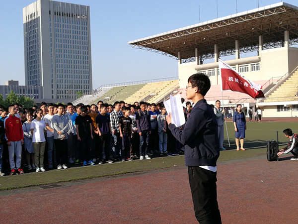 早上7时20分,伴随着《义勇军进行曲》激昂的旋律,鲜艳的五星红旗冉冉升起,全体学生面向国旗庄严肃立,行注目礼,轻唱国歌。之后,学生代表,机械设计制造及其自动化15-2班韩敬伟同学在国旗下发表“大国之崛起,你我之重任”演讲。他先用天宫一号与天宫二号顺利对接引出“中国航天日”的主题,之后又从自身经历和身边小事出发,呼吁同学们关心国家大事,将个人价值的实现与国家民族的前途命运紧密联系在一起,为实现中华民族的伟大复兴贡献自己的力量。最后,他引用了《大国崛起》中的旁白来结束今天激情澎湃的演讲,“一个懂得尊重思想的民族才能产生伟大的思想,一个拥有伟大思想的民族,才能拥有不断前行的力量。”